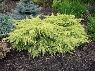 Ялівець середній Aurea - це гібрид з жовтою кроною сорту ялівцю середнього. Рослина швидкозростаюча в 10-річному віці до 1 м, діаметр крони до 4 м. Крона широка, середньої щільності. Забарвлення рослини інтенсивно жовте, влітку молоді пагони трохи зеленіші. Даний сорт ялівцю рекомендований для висадки в санаторіях через інтенсивне виділення фітонцидів (біологічно активні речовини з вираженою антимікробною дією). Рослина відрізняється підвищеною стійкістю до погодних умов (морози, посуха). До грунту не вимоглива, але краще росте на освітлених ділянках, де рослина не втрачає яскравого забарвлення крони.