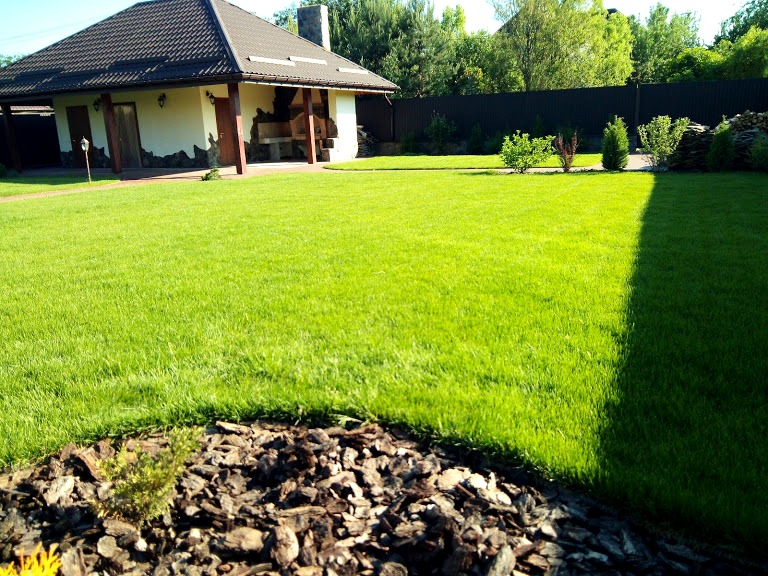 Територію розбито доріжками на окремі частини які в свою чергу підкреслені цікавими клумбами та рокаріями. Завдяки рулонному газону територія швидко набрала завершеного вигляду та потребує мінімум зусиль до догляду так як всі насадження були замульчовані корою та декоративними засипками.