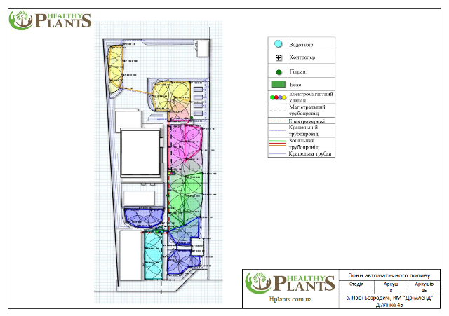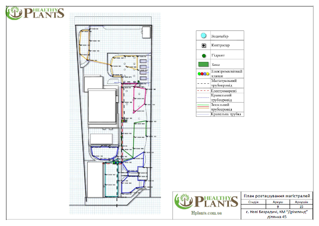 Cxeмa poзмiщeння тpyбoпpoвoдiв, фopcyнoк, тpy6oк крaпeлънoгo пoливy, щo 6yдyтъ зa6eзпeчyвaти cвoєчacнe тa piвнoмipнe opoшeння тepитopiï тa нacaджeнъ.