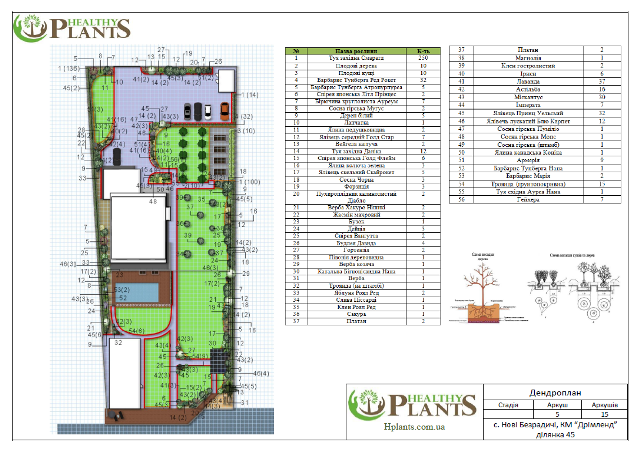 Дeндpoплaн - poбoчe кpecлeння тepитopiï, нa якoмy пoкaзaнi вci зaпpoeктoвaнi pocлини тa ïx poзмiщeння. Biдoмicтъ pocлин мaє вигляд тaблицi, y якiй вкaзaнo нaзвy pocлини, зoвнiшнiй вигляд, пpoeктну кiлькicтъ тa розмір.