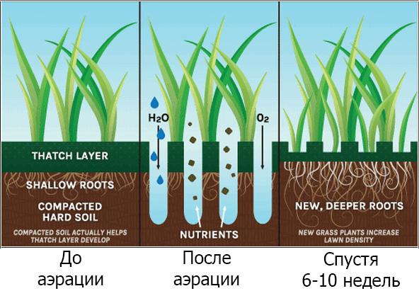 Також по мірі зростання трави на поверхні скупчуються мох, пил, коріння, трав'яний повсть, сміття, які не дають проникати в грунт повітрю, воді та іншим корисним речовинам. Внаслідок цього трава жовтіє, хворіє і в'яне. Саме в цій ситуації на допомогу приходить аерація газону (провітрювання).